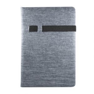 Libreta forrada en tela, banda elástica, separador, sujetador de bolígrafo y 80 hojas rayadas.