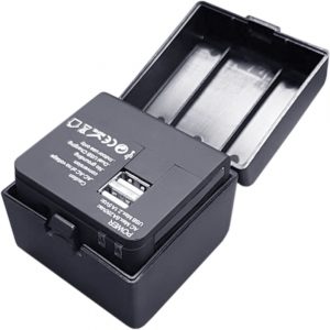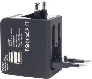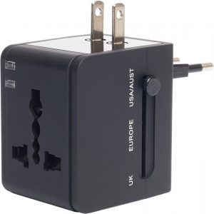 Adaptador universal para contactos eléctricos dos entradas USB para utilizarlo como cargador, boton push que al presionar saca tres adaptadores UK, USA/ASUT y europeo