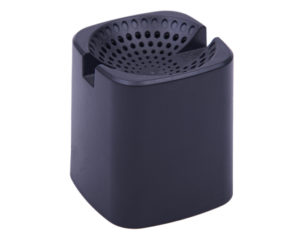 Bocina Bluetooth con manos libres, ranura para colocar el teléfono en la bocina. Botón de encendido y cable de carga.
