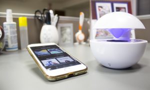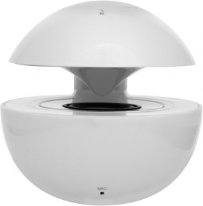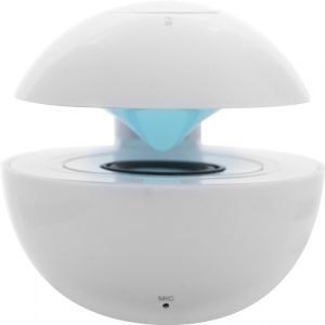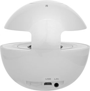 Luz interna que cambia de color. En la parte superior, controles de volumen, play/pausa y modo. Botón on/off en la base.  Alcance 10 metros.
