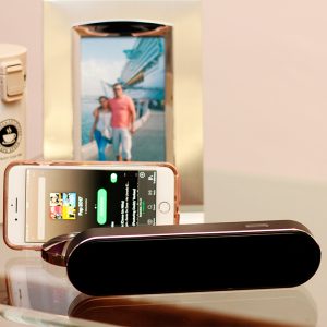 Bocina metálica recargable con bluetooth 4.0, batería de 2000 mah, duración hasta 16 h, tiempo de carga 3.5 h y micrófono integrado.