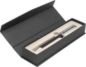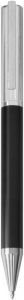 Bolígrafo con apertura giratoria. Destape plateado en la parte inferior. Cuerpo color negro. Clip, tambor superior y puntera color plata. Tinta negra. Estuche con cierre magnético.