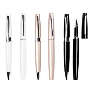 Set de bolígrafos en metal brillante ball pen y roller con tinta negra de escritura, incluye estuche.