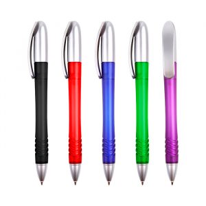Bolígrafo de plástico con accesorios color plata y tinta negra.