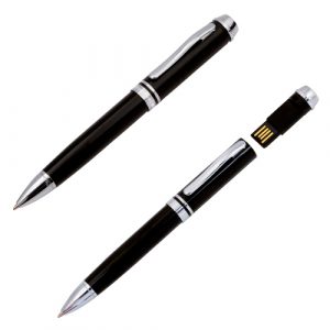 Bolígrafo metálico con USB en color negro con tinta azul. Capacidad 8GB. Presentación en caja individual.