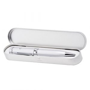 De metal con USB de 8GB y señalador láser. Incluye estuche metálico. Disponible en colores negro y plata.