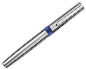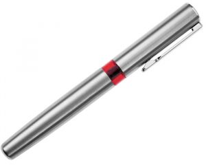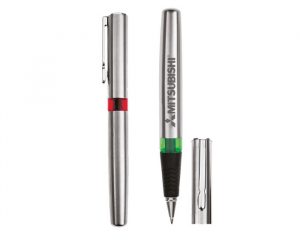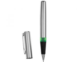 Bolígrafo de metal tipo roller con cuerpo y tapa de acero inoxidable. Anillo de plástico translúcido, punta de acero inoxidable con goma antideslizante.
