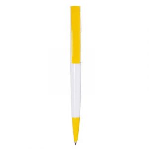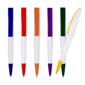 Bolígrafo plástico con mecanismo de giro y aplicaciones de colores.