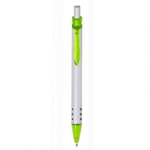 Bolígrafo plástico con aplicaciones de colores transparentes.