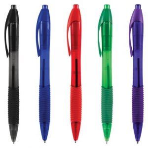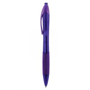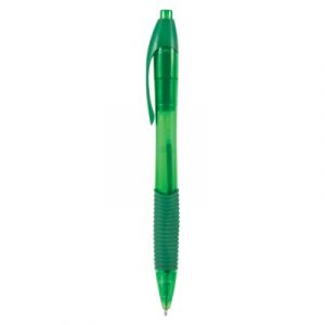 Bolígrafo plástico traslúcido, zona de sujeción de caucho y tinta de baja viscosidad.