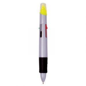 Bolígrafo plástico de 4 colores (negro, rojo, verde y azul) y un marca textos en la parte superior.