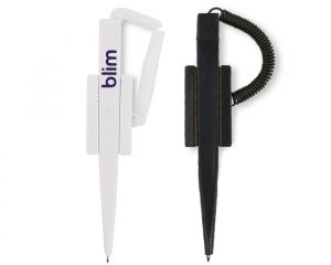 Bolígrafo de plástico de cuerpo plano con cubierta adherible en la parte de atrás, para ser colocado en escritorios, recepciones y superficies planas. Cuenta con cuerda elástica que se articula a la base del plástico. Puede ser colocado de manera horizontal o vertical. Con tapa de plástico en la punta del bolígrafo.