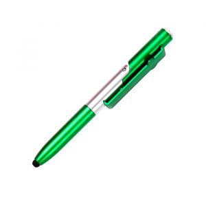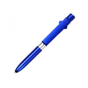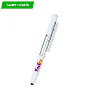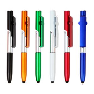 Bolígrafo de plástico con lámpara, puntero touch y diseño base para celular con tinta negra.
