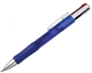 Bolígrafo de plástico 4 tintas en 1: Roja, Azul, Verde y Negra, con clip metálico. Mecanismo deslizante.