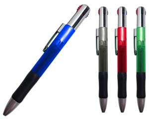 Bolígrafo de plástico 4 tintas en 1: Roja, Azul, Verde y Negra, con clip metálico. Mecanismo deslizante.