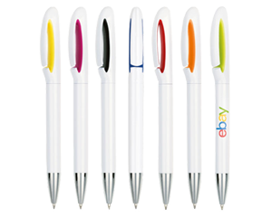 Bolígrafo plástico de cuerpo blanco con punta cromada. Novedoso diseño de clip con detalle en color. Ligero y cómodo. Mecanismo retráctil.