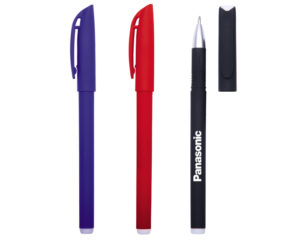 Bolígrafo de tinta de gel con recubrimiento de goma, cuerpo y tapa de color.