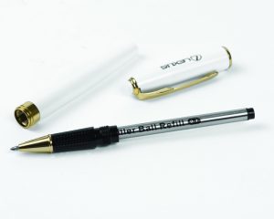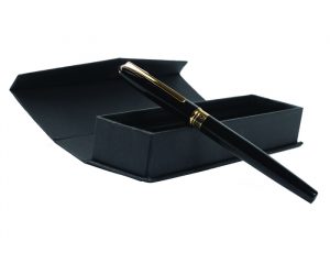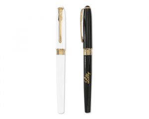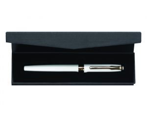 Elegante bolígrafo metálico tipo roller de tinta alemana, con clip y detalles bañados en oro de 18 kilates. Cuenta con tapa que cierra a presión y repuesto especial con rosca para sujetarse firmemente. Incluye estuche de regalo en color negro.