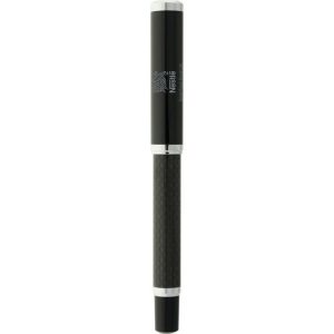 Metálico con tapón que cierra a presión. Acabado negro brillante. Detalles color cromo y cuerpo de fibra de carbono que le da ese singular diseño cuadriculado. Con tapón robusto. Escritura de alto desempeño debido a su repuesto japonés tipo roller (a elegir entre tinta negra ó azul). Incluye estuche individual.