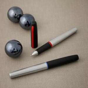Metálico con tapón que cierra a presión. Cuerpo color plata y tapón negro con detalles rojos ó azules. Escritura de alto desempeño debido a su repuesto japonés tipo roller (a elegir entre tinta negra ó azul). Incluye estuche individual.
