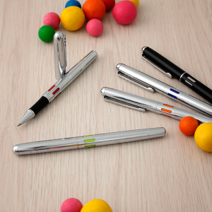 Metálico con tapón de cierre a presión. Acabado cromado en todo el cuerpo. Sutiles detalles de color en ventanillas ovaladas que rodean la parte superior del barril. Escritura de alto desempeño debido a su repuesto japonés tipo roller (a elegir entre tinta negra ó azul). Incluye estuche individual.