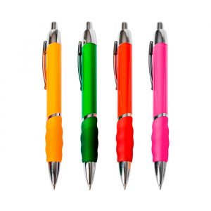 Bolígrafo de plástico retráctil con grip y tinta negra.