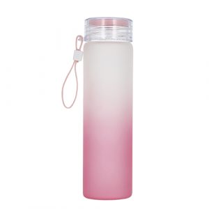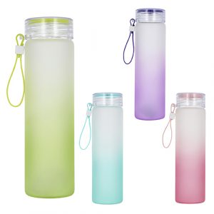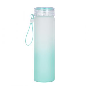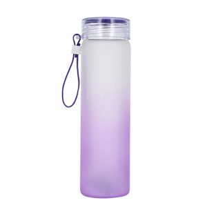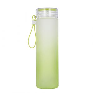 Botella de vidrio para agua con tapa tipo rosca y correa de silicón. Capacidad de 320 ml.