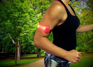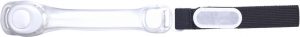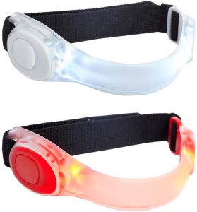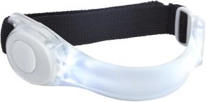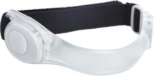 Brazalete ajustable con cierre de velcro y detalle reflejante. 2 luces led que permite 2 formas de alumbrar: fijo/estable y la segundo intermitente. Botón de encendido y apagado. Incluye batería.