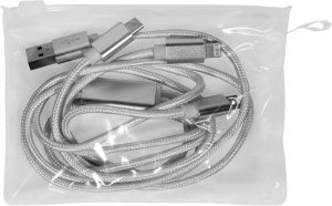 Cable con entrada USB y diferentes adaptadores: Iphone, tipo C y Android. Viene dentro de una bolsa plásticas con cierre ziploc.