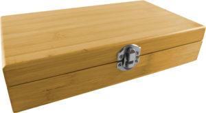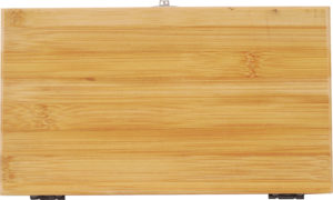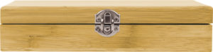 Caja de madera bambú, cierre metálico con set de 5 piezas de bar: sacacorchos, tapón, cortagota, termómetro y vertedor.