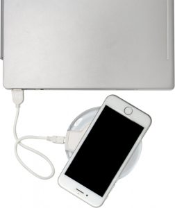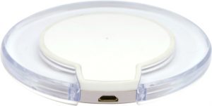 Cargador inalámbrico, apoyando el celular comienza a cargar, es necesario que el cargador esté enchufado para que pueda funcionar y darle carga al celular. Una entrada mini USB. Es importante sacar la funda para facilitar la carga