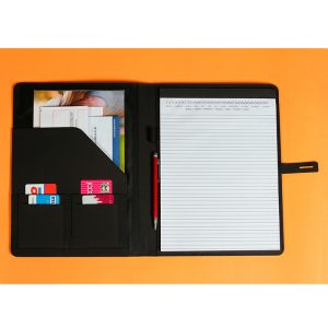 Carpeta con block de 50 hojas tamaño a4, porta pluma, broche de seguridad y compartimentos interiores