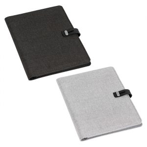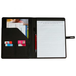 Carpeta con block de 50 hojas tamaño a4, porta pluma, broche de seguridad y compartimentos interiores