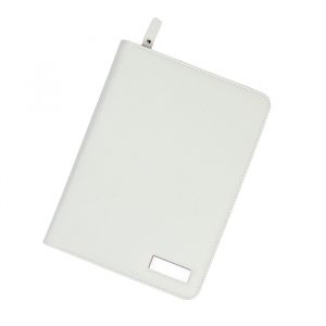 Carpeta de curpiel con cierre, block con 50 hojas tamaño A5, placa metálica, porta tarjetas y porta mini iPad.