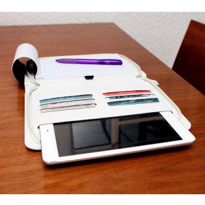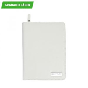Carpeta de curpiel con cierre, block con 50 hojas tamaño A5, placa metálica, porta tarjetas y porta mini iPad.