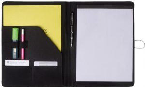 Carpeta de microfibra con block de hojas blanca. Cierre con banda elástica. 3 presillas para bolígrafos. Folder interno. Compartimentos internos para tarjetas.
