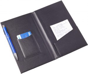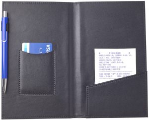Carpeta para comanda. En la parte interior del lado izquierdo sobre para tarjeta y porta bolígrafo, lado derecho sobre para ticket.