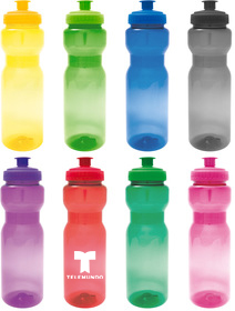 De plástico con tapa a rosca y boquilla deportiva de plástico. No utilizar con bebidas gaseosas.