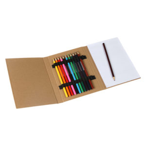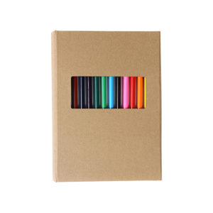 Set ecológico fabricado en cartón con 12 lápices de colores y block con 50 hojas blancas.