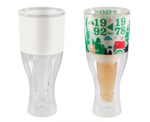 Copa mediana de vidrio de doble pared, base interior flotante en forma de botella de cerveza.