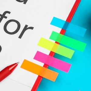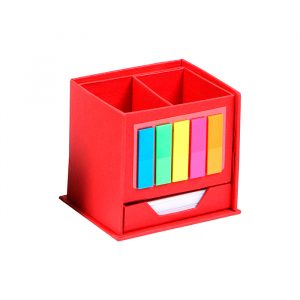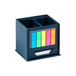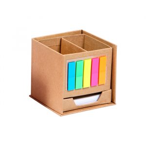 Cubo ecológico con hojas para notas, 100 banderas de colores adheribles y porta plumas.