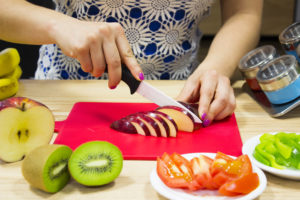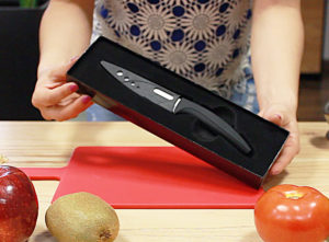 Cuchillo con navaja de cerámica con mango de goma y funda de plástico.