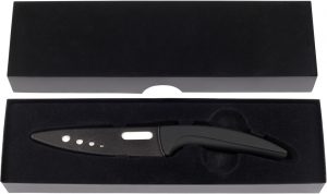 Cuchillo con navaja de cerámica con mango de goma y funda de plástico.