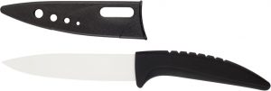Cuchillo con navaja de cerámica con mango de goma y funda de plástico.
