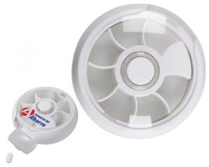 Despachador giratorio de pastillas. Con 7 divisiones. El mecanismo se activa presionando el botón para cambiar de compartimento.