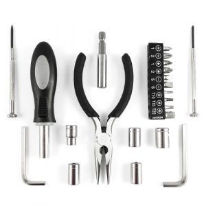 Incluye: pinzas, 2 desarmadores, 10 puntas intercambiables, adaptador para puntas, 5 dados, 2 llaves Allen, mango para dados.