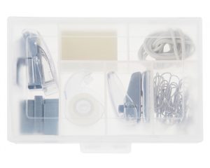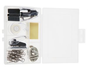 Juego escolar en estuche color banco. Contiene: Engrapadora, Grapas, Perforadora, Notas, Cinta adhesiva, Clips, Ligas.