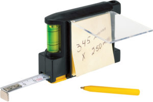 Flexómetro con nivel, notas adhesivas, bolígrafo y cinta de 2 metros.
