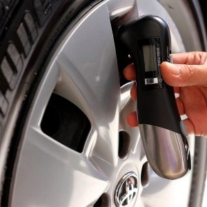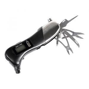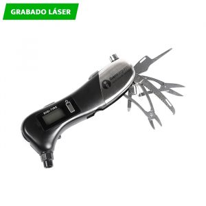 Herramienta de emergencia con medidor de aire digital, luz led y navaja multifunciones.