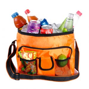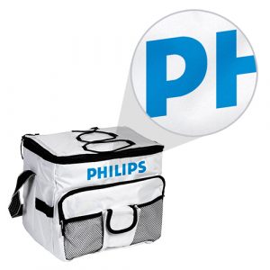 Térmica fabricada en poliéster con interior en polietileno con asa y bolsa al frente.
